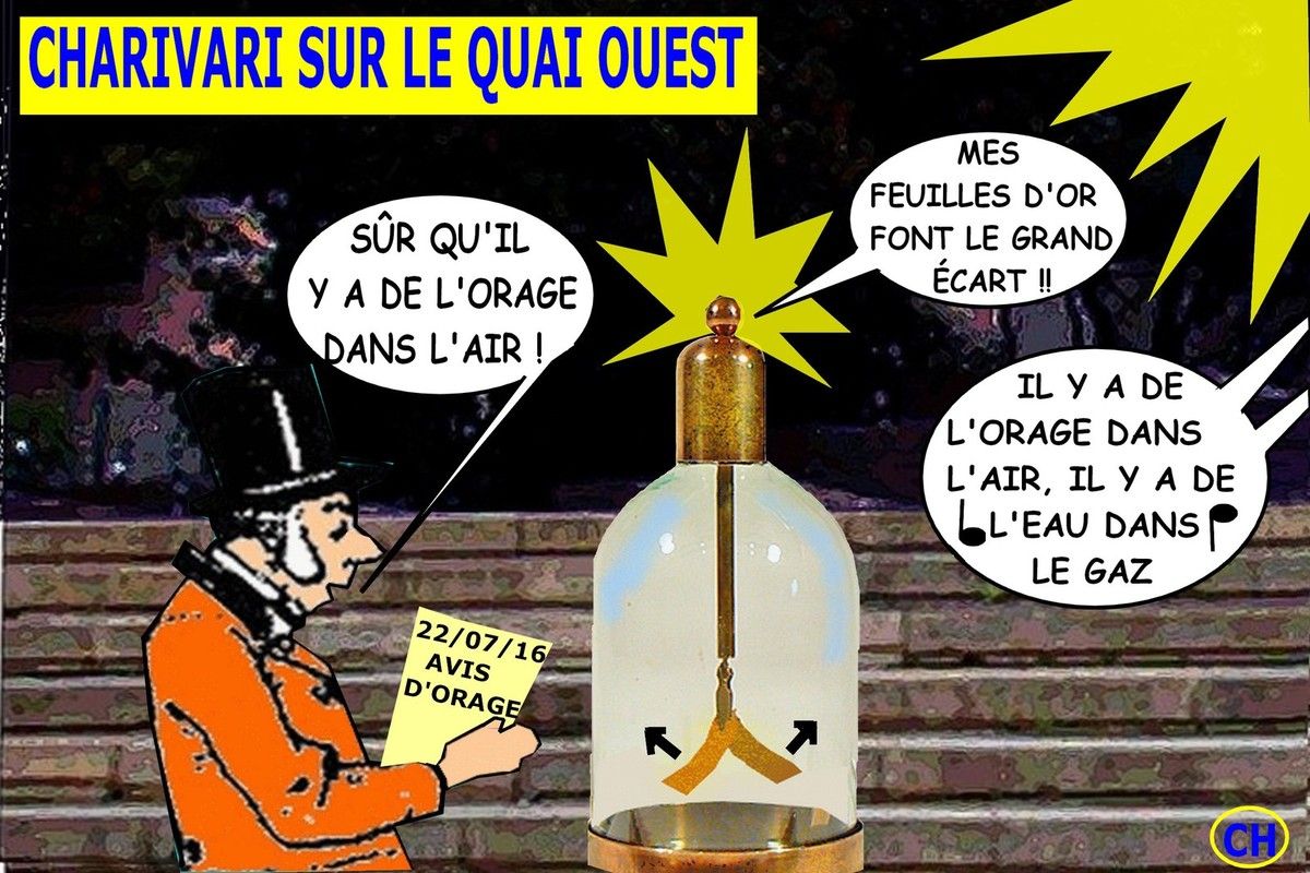 – Je te répète, ce soir-là, il y avait de l’orage dans l’air ! Du coup, c’est vrai, il n’y a pas eu de marché nocturne ! Mais il paraîtrait quand même qu’il y aurait eu comme du charivari sur le Quai Ouest ! C’est qu’il y avait beaucoup d’électricité dans l’air, et semble-t-il, même, quelques étincelles. Si tu ne me crois pas, tu n’as qu’à te renseigner et demander au Savant Cosinus et à son électroscope ! Il fallait le voir, ce soir-là, faire le grand écart avec ses feuilles d’or ! Un vrai petit rat de l’Opéra !